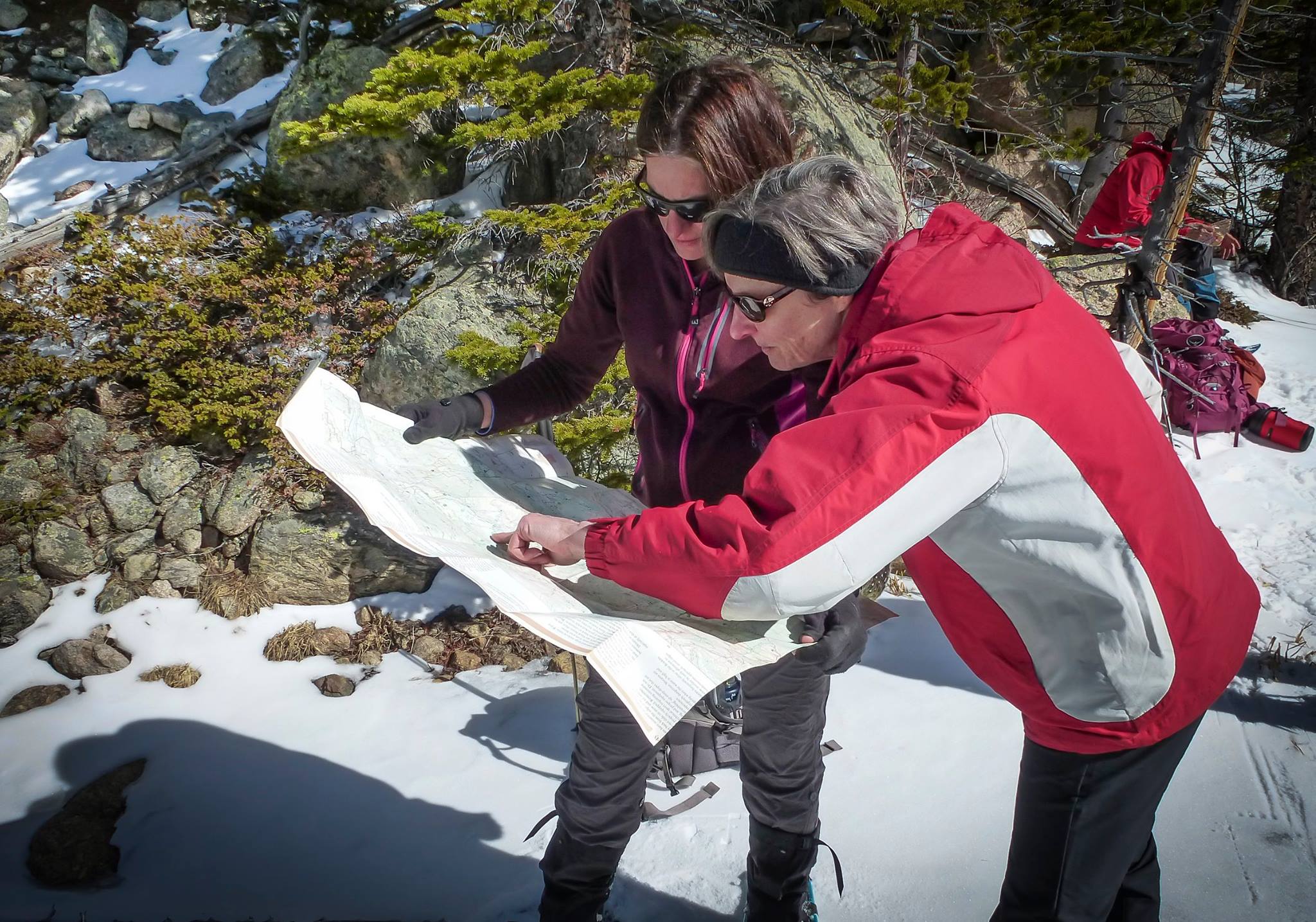 Loveland Mountain Club members Jane Davis, right, and Tonya Russell read a map for a summer hike to The Loch in Rocky Mountain National Park.